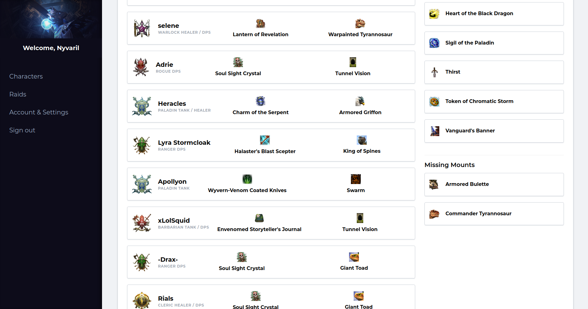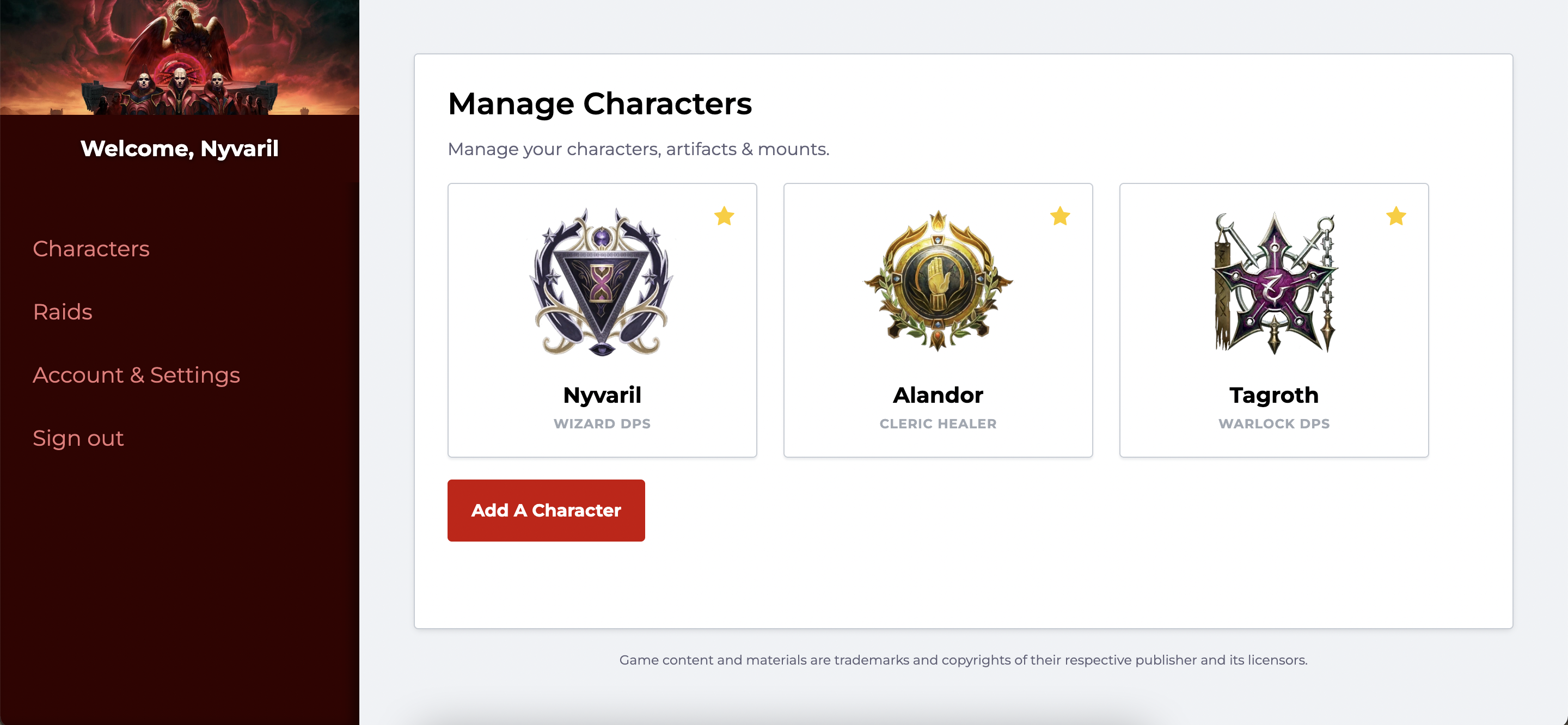 Keep track of which of your characters have access to which artifacts, companions, and mount powers. When you get invited to a raid group, all you'll need to do is click the unique link for that raid, confirm which character you're playing, and voila! Halaster's magic will handle the rest.